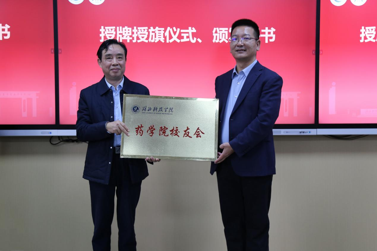 陈洪国代表学校校友总会宣读了《关于同意湖北科技学院药学院校友会第一届理事会名誉会长、会长、副会长、秘书长等主要人选的批复》,并授牌、授旗、颁发理事会聘书。