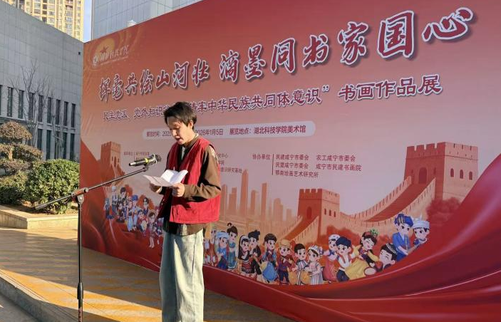 12月19日上午,“挥毫共绘山河壮 滴墨同书家国心”——民主党派、党外知识分子'铸牢中华民族共同体意识'书画作品展"在湖北科技学院美术馆盛大启幕。此次展览恰逢艺术与设计学院校友会成立前夕,成为凝聚校友情感、彰显校友担当、共促学校发展的重要纽带,来自2005级至2021级的各地校友代表重返母校,与师生共赴这场艺术与家国情怀交织的文化盛会。